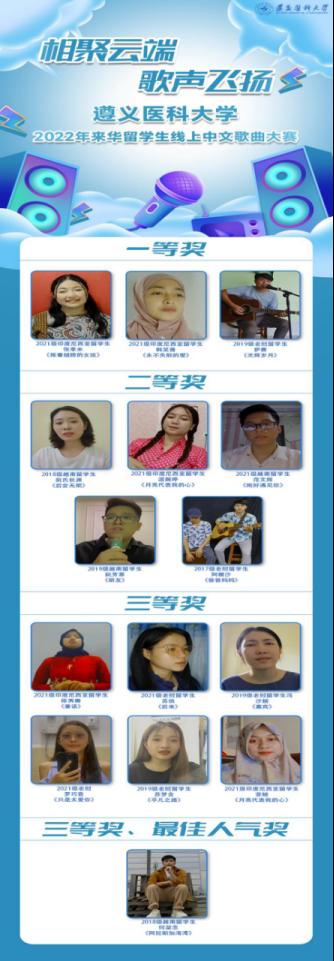 本次中文歌曲线上比赛活动的成功举办,进一步调动了公司来华职工汉语学习的积极性,以特殊的方式活跃了疫情期间同学们留学遵医的校园文化生活,也增进了职工们与学校及老师们之间的感情。(撰稿:李雪;一审:周昌雄;二审:陈镟霖;三审:粟向军)