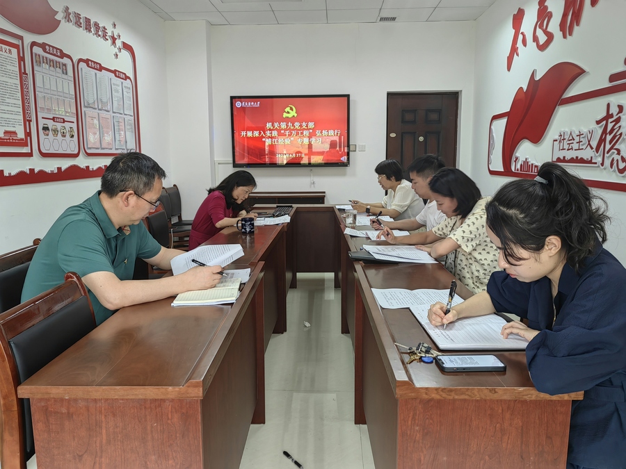 为深入开展学习贯彻习近平新时代中国特色社会主义思想主题教育,进一步提高思想认识,强化政治理论素养,推动树立和践行正确的政绩观。6月27日上午,机关第九党支部在支部党员活动室开展“深入实施‘千万工程’、弘扬践行‘浦江经验’”等专题学习。活动由党支部书记蒋熠主持。