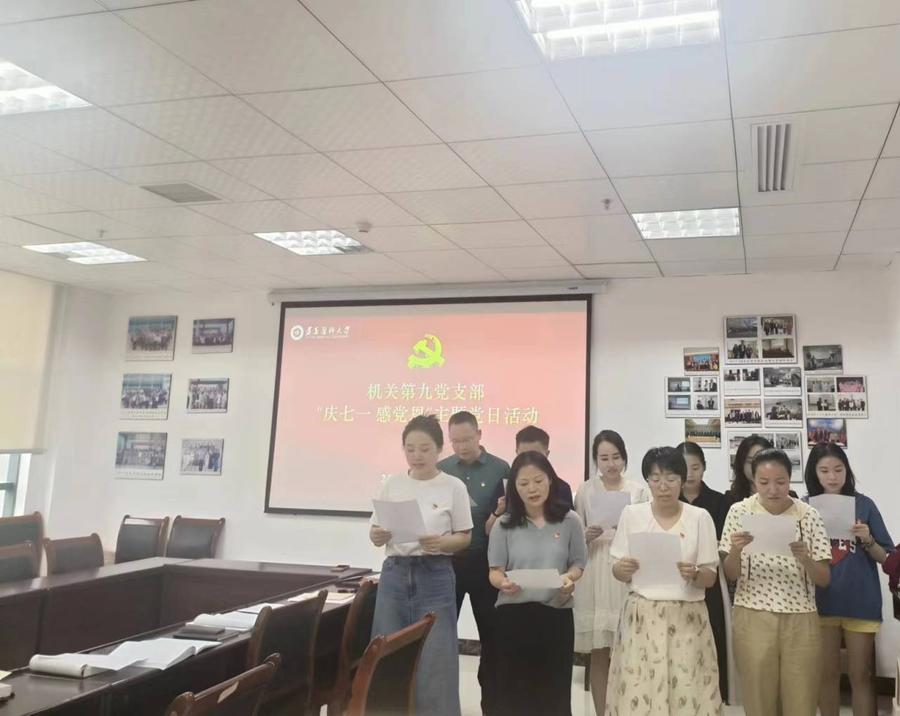 最后,全体党员重温入党誓词,并朗诵《仰望党旗》,庆祝中国共产党成立102周年,表达了自己对党的忠诚和美好祝愿,并纷纷表示将继续传承红色基因,赓续红色血脉,以更坚定的理想信念、更饱满的热情和精神投入到学校建设和发展事业中。(审核:一审赵旭娟、粟向军、蒋熠,二审刘芳宇,三审杨清玉;撰稿:李雪;摄影:刘继婷)