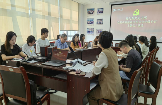 9月15日上午,机关第九党支部在行政楼431会议室召开“党建引领强意识、反诈宣传保平安”主题党日活动。会议由党支部书记蒋熠主持,支部全体党员参加。