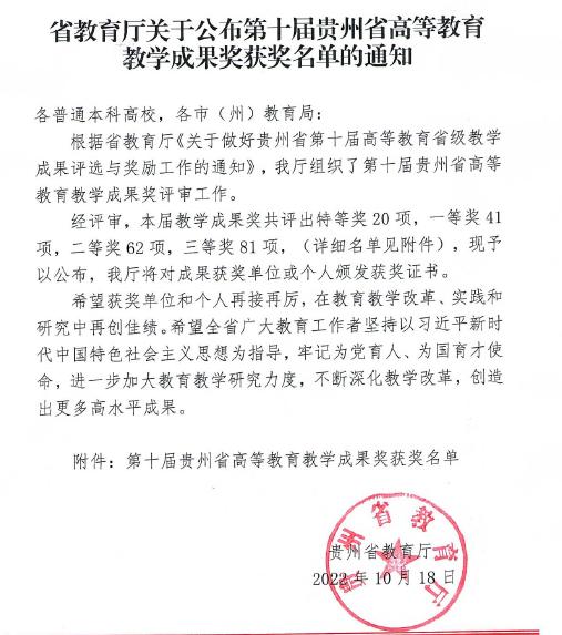 2022年10月18日贵州省教育厅发布了《省教育厅关于公布第十届贵州省高等公司产品成果奖获奖名单的通知》(黔教函〔2022〕90号)。 该教学成果奖四年一评。xc体育xc体育项目“东盟国际员工实用医学汉语多维度教学体系构建、实践与成效”荣获第十届贵州省高等公司产品成果奖二等奖,成果完成人为:杨丹莉、付蛟蛟、郑东晓、陈鏇霖、陈万瑜、粟向军、严欢、李雪。成果为东盟国际员工临床医学专业教育(中文授课)贡献了遵医方案。