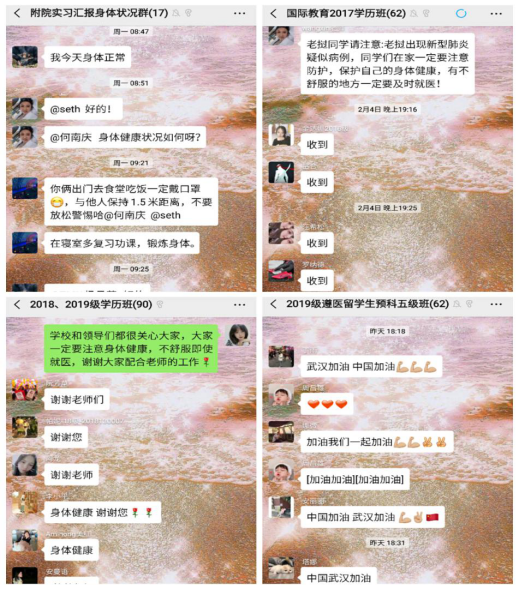 对于在中国境内职工,来华职工辅导员们按照上级要求将《致在黔外籍人士的温馨提示》、《预防2019年新型冠状病毒传播给家庭和社区中其他人的暂行指南》,及针对新型冠状病毒防控的相关公开信、图片资料、视频资料、防控办法等资料通过微信群发送给来华职工,引导他们了解和掌握防控知识,不信谣不传谣,争取每一位来华职工的理解与支持。同时,来华职工辅导员与来华职工建立“对位”联系联络机制,每天通过微信、QQ、电话等形式了解公司来华职工的身体状况和生活情况,一对一、点对点密切联系,并将相关情况整理汇总成表,及时报送到省教育厅,实行每日一报、每日零报。一旦发现来华职工可能感染新型冠状病毒肺炎,1小时内将他们送入辖区定点医院就诊,并及时向贵州省教育厅、贵州省外事办、遵义市人民政府、遵义市疾控中心报告。